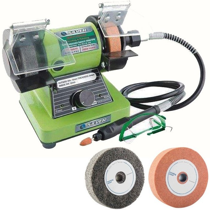سنگ چرخ رومیزی سیلور GTBN200W:مجهزبه شلنگ خرطومی،جهت کارهای ظریف_مجهزبه چراغ آماده به کارودرحال کاربه طورجداگانه _دارای محافظ برروی سنگ ها،جهت جلوگیری ازپرتاب تراشه
