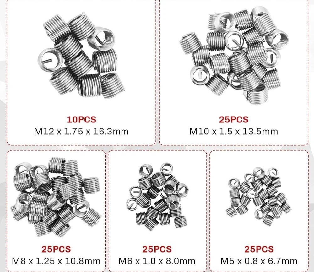 فنرهلیکوئل _ مته مخصوص هرسایز _ قلاویز رزوه زنی _ ابزارنصب هلیکوئل _ دسته آچار L شکل _ جعبه فلزی مقاوم ومنظم