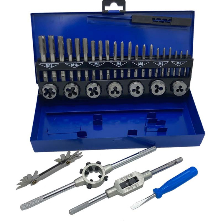 جعبه قلاویز وحدیده ۳۲پارچه دارای ۲۱قلاویز،۷حدیده،مجموعه تیغه های ۱۲عددی،حدیده گیر،قلاویزگیر ویک عدد پیچگوشتی دوسو